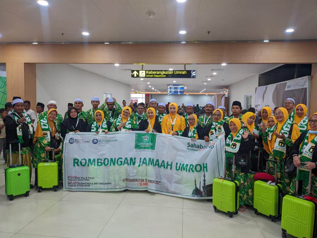 Surabaya, 12 Januari 2025 – UGTMAS melaksanakan prosesi keberangkatan umroh untuk kloter pertama pada pukul 11.30 WIB diikuti oleh jamaah dari wilayah timur meliputi Pasuruan, Malang, dan Banyuwangi, sedangkan jamaah yang dari wilayah barat langsung menunggu di titik kumpul yakni Masjid Al-Ikhlas, dekat pintu masuk bandara. Mereka penuh antusias mengikuti prosesi sekaligus memulai perjalanannya menuju Tanah Suci.